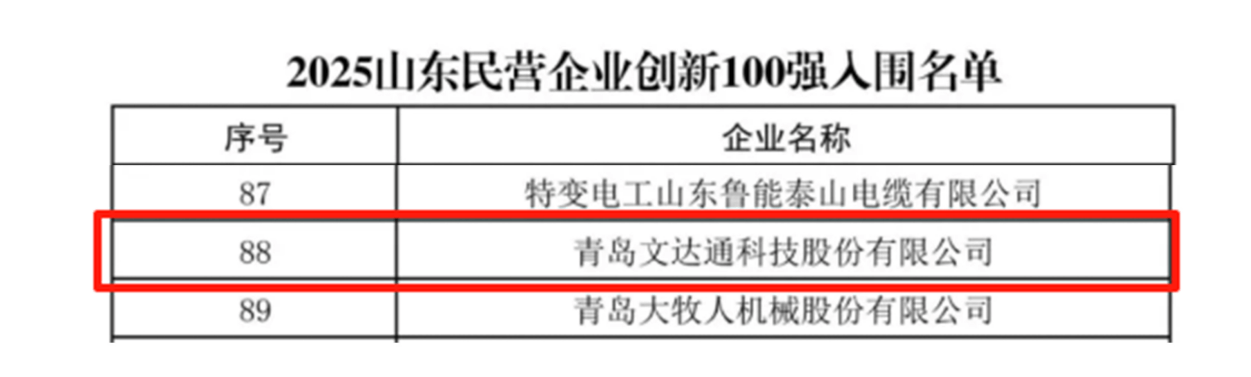 青島文達通科技股份有限公司位列“2025山東民營企業(yè)創(chuàng)新100強”第88位。